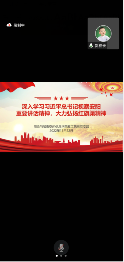 (通讯员:郭军学)为深入学习贯彻习近平总书记视察安阳重要讲话精神,全面加强党员作风建设,引导党员深刻理解把握红旗渠精神,2022年11月22日下午,测绘学院教工第三党支部组织召开了“深入学习习近平总书记视察安阳重要讲话精神,大力弘扬红旗渠精神”专题组织生活会。会议由组织委员郭军学主持,支部全体党员参加。副校长贺国营以普通党员身份参加了专题组织生活会,测绘学院党委书记米启超、院长高松峰、副书记卫柳艳列席了本次会议。