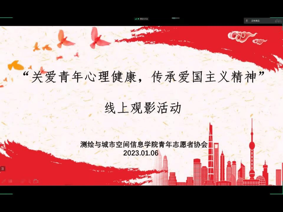 (通讯员谢浩 尹淑娟)为进一步弘扬爱国主义精神,强化使命担当,激发奋进力量,同时也培养同学们良好的心理素质,缓解近期学习生活的紧张状态,测绘与城市空间信息学院青年志愿者协会于1月6日举办线上观影活动。活动以“关爱青年心理健康,传承爱国主义精神”为主题,在腾讯会议召开。有216名同学参加了观影活动。
