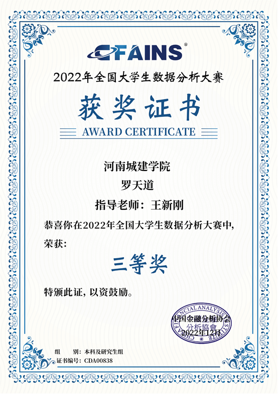 2022年全国大学生数据分析大赛三等奖学生:罗天道。指导老师:王新刚。