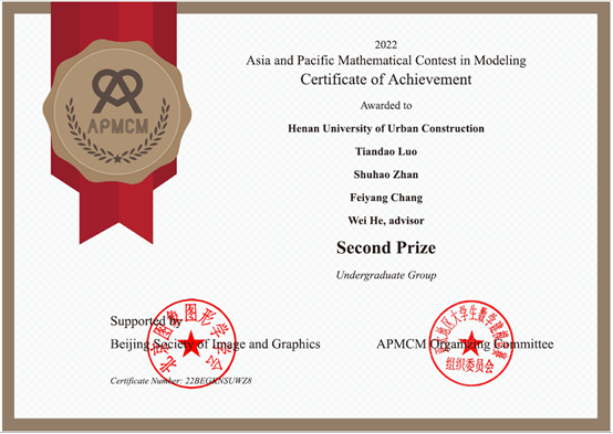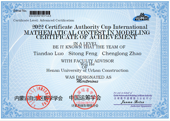 2022年第十二届APMCM亚太地区大学生数学建模竞赛二等奖学生:罗天道,詹书豪,常飞阳。指导老师:贺伟。