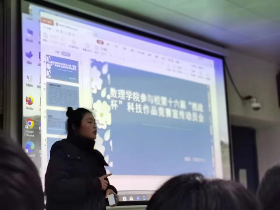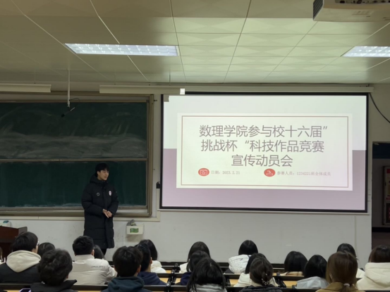 (通讯员 高明阳 李宇恒 张恒)“挑战筑造梦想,创新成就未来”,为提高大学生创新思维能力,增加大学生科研知识储备,培养实践应用能力。2月23日至24日,由数理学院学生会科创学习部主办,各班团支部承办的第十六届“挑战杯”科技作品竞赛的宣传动员会陆续在七号楼举行。