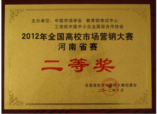 近日,由我校工商管理系6名同学组成的两支代表队在许昌举行的第五届全国高校市场营销大赛河南赛区总决赛中分别荣获一等奖、二等奖,毕军贤、毛振福、刘庆华、郑萌等获得“最佳指导老师”奖。