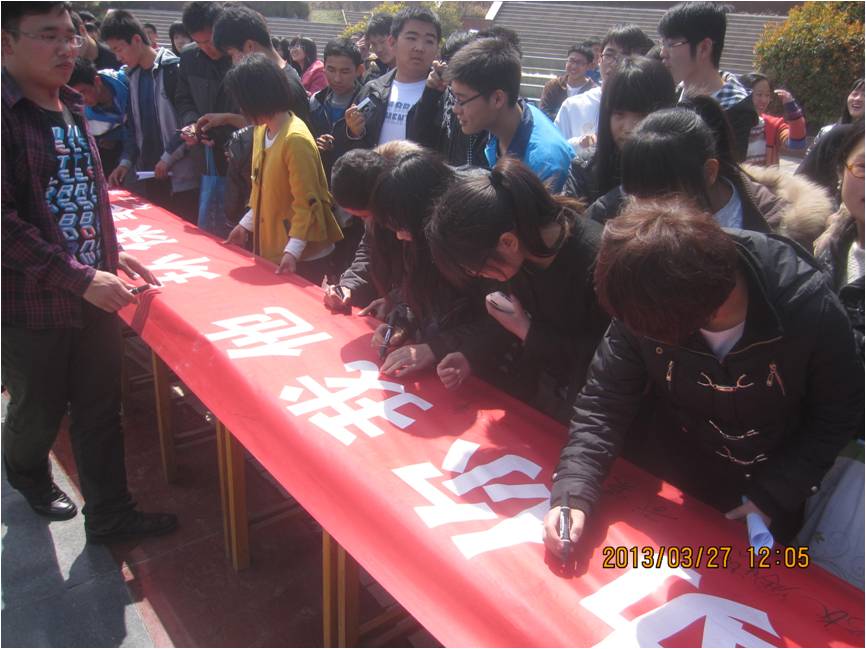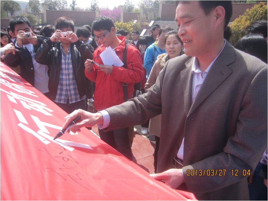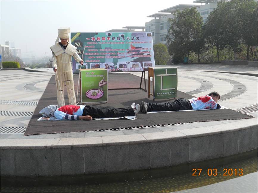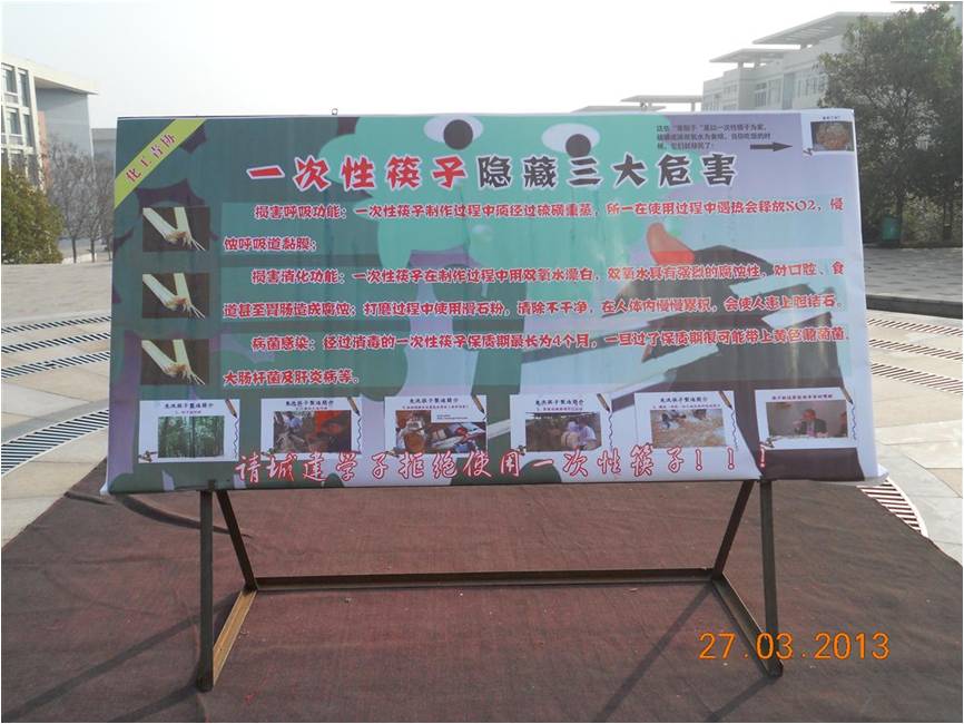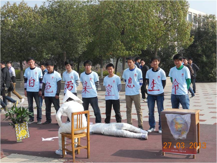 活动分为四大部分:“筷”行动、莫迟疑,你我塑料人,白色污染、窒息生命和“践行在现场”大型签名活动。其中“筷”行动、莫迟疑部分通过学生演示和展板说明,清晰明了地展现了一次性筷子的危害;“你我塑料人”部分通过塑料瓶制成的小工艺品说明了回收利用废弃物的必要性;“白色污染、窒息生命”环节更是别出心裁,两名队员身上完全用塑料袋缠绕,突出窒息生命的主题,同时提醒大家拒绝使用一次性筷子。该系党总支书记赵宝山带头在现场签名,用自己的实际行动号召人们走绿色环保之路,并为活动提出了指导和建议。