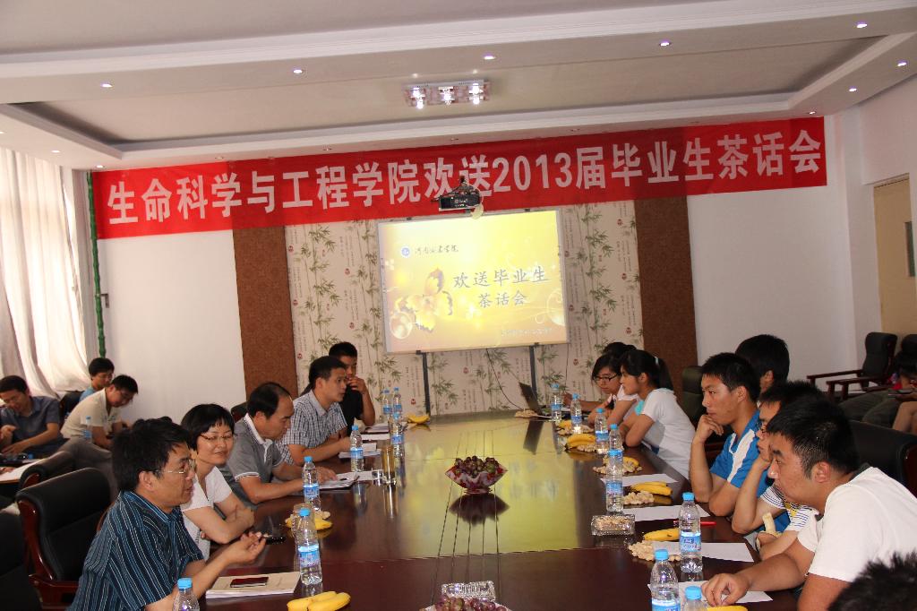 (通讯员 陈舒)四年时光容易过,一朝毕业不了情。2013年6月14号下午三点,生命科学与工程学院在六号楼二楼会议室举行欢送毕业生茶话会。生科学院党支部书记殷战稳、院长赵安芳,副书记李涛飞、学工办主任、教研室主任、毕业生辅导员以及部分学生代表参加了本次茶话会。茶话会由李涛飞主持。