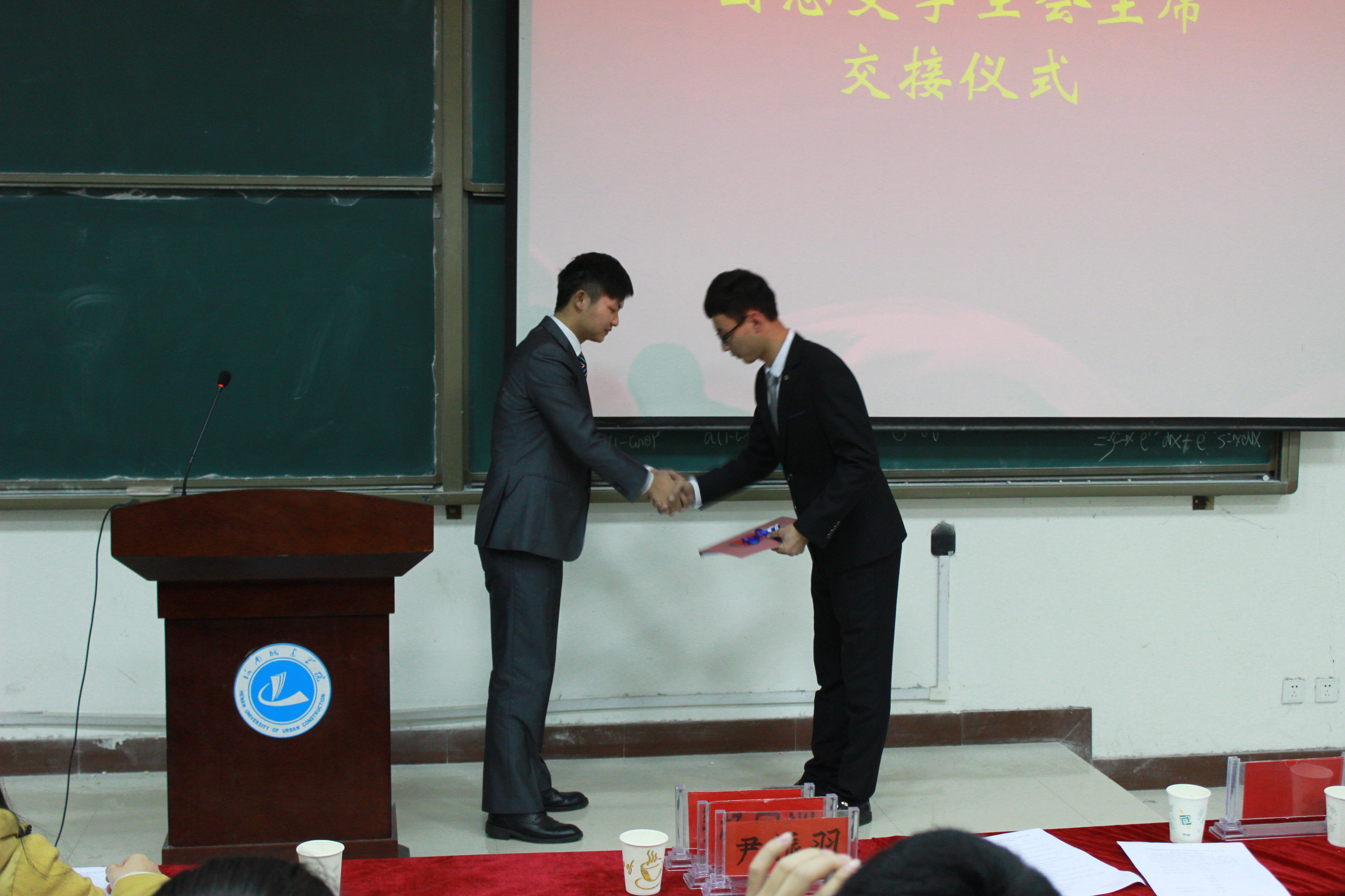 仪式上,新老学生会主席团成员之间进行了交接。上届学生会团总副书记徐彦博同学代表老一届学生会发言;新一届学生会主席付庆庆同学做了慷慨激昂的就职报告。