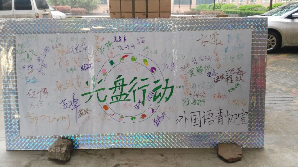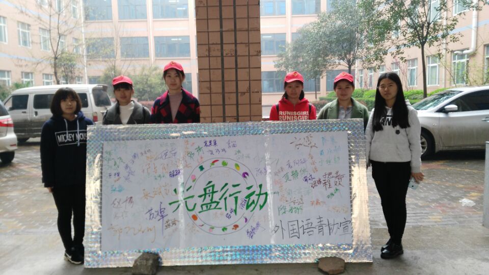 (通讯员 田果果 张秋梦)为弘扬中华民族勤俭节约的美德,杜绝餐桌上的浪费,外国语学院青年志愿者协会于3月30日中午在文管校区一号教学楼前,举办“光盘行动――从你我做起”主题签名活动。