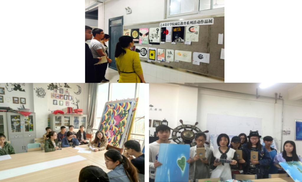学院以班为单位开展“诚信”主题班会,各班紧扣主题,开展形式多样的班会活动。 为提高同学们的诚信意识和坚守诚信的热情,学院还召开了“诚信宣传标语征集”活动,征集了全院千余份原创标语,同学们通过简练形象的语言,深刻体会到诚信的重要性。在“诚信海报征集”活动中,发挥艺术生的优势,将“诚信”二字创意化。学院团总支对参与作品进行评选并展览了部分优秀作品。最终有19条格言和15幅作品获奖。在贷款座谈会上,贷款主管老师张悦扬对还贷款的方法及注意事项进行讨论,并强调诚信还贷的重要性。