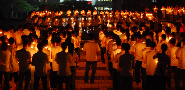 5月21日晚,我院近万名师生自发地聚集到中心文化广场,用烛光为在四川地震中不幸遇难的同胞送行,愿他们一路走好;为四川人民、为我们的祖国祈福,愿四川人民的明天会更加美好,伟大的祖国更加繁荣昌盛。