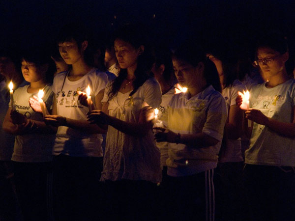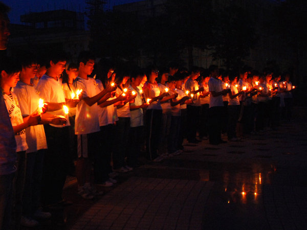 19时50分,“为中国加油、为四川加油、为灾区人民加油”、“汶川挺住、四川挺住、中国挺住”的口号声震撼了整个校园。烛光静穆活后,大部分同学迟迟不忍离去,用各种方式表达着对遇难同胞的深切哀悼和怀念之情!