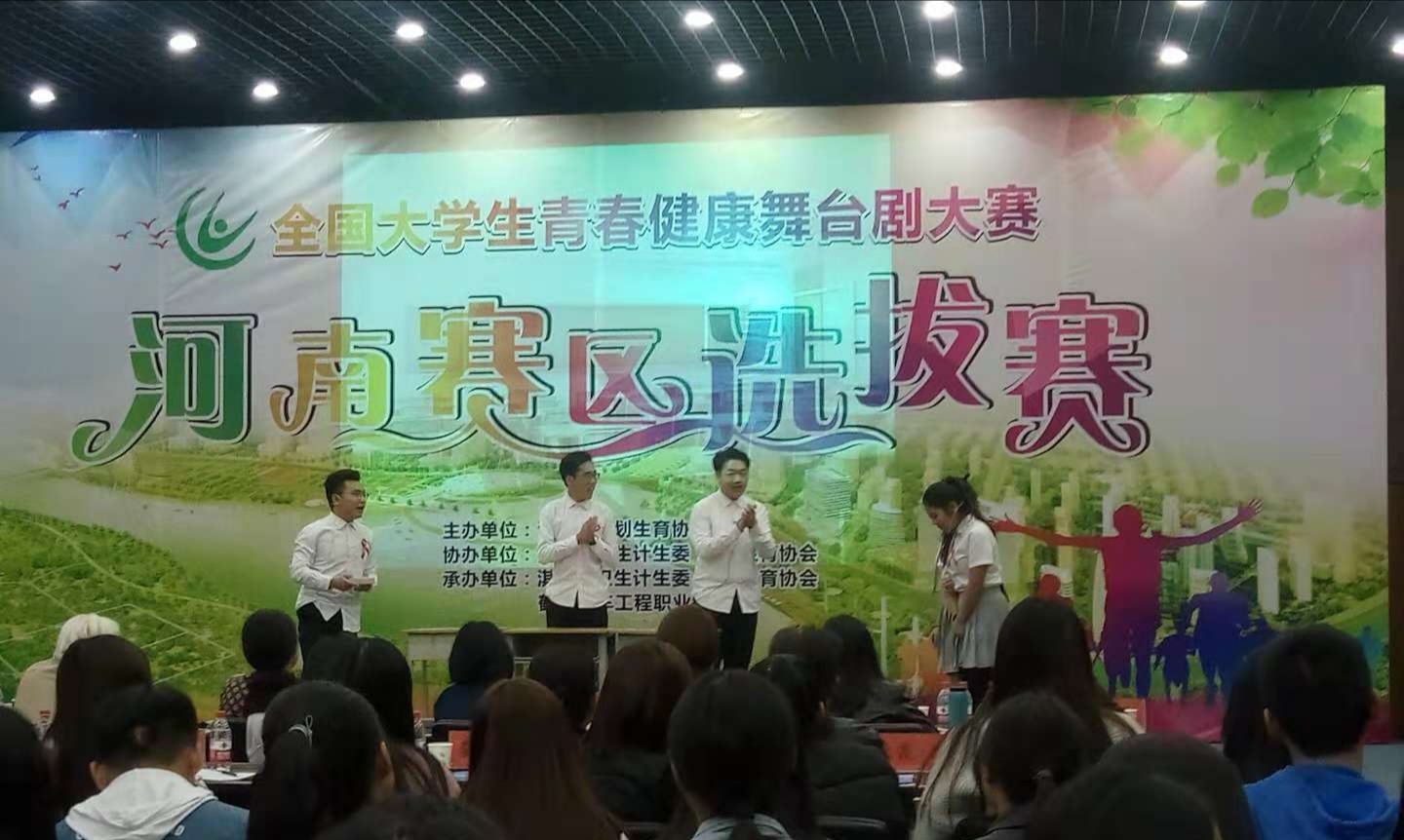 (通讯员 贾汛)10月26日上午,由河南省计划生育协会主办的全国大学生青春健康舞台剧大赛河南赛区选拔赛在鹤壁汽车工程职业学院举行。省内8所高校代表队约200余人参加此次比赛,我市由平顶山市计生协会领导带队,我校由大学生心理健康教育指导中心主任李红亚、专职教师贾汛指导,赵鸿达、魏琦林、孙天琪、黄治均、张方圆、李文豪六位同学组成的代表队的参赛作品《当艾遇到爱》在比赛中荣获第四名,全省三等奖。