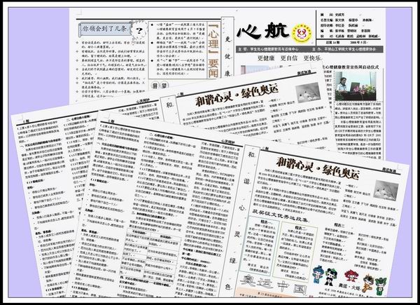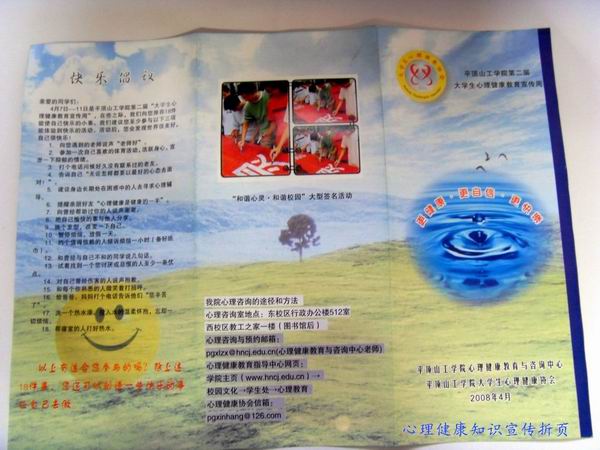 在宣传周活动期间,我院共出展板20余块,宣传标语10多幅,编辑第13期《心航》和第14期“5.25”《心航》专刊各1000余份,发放宣传折页1000余份。各院(系)根据自己的实际召开心理健康教育座谈会或主题班会,布置心理健康教育的学习园地。同时,通过校园网、心理健康教育简报、橱窗、心理教育宣传栏等多种途径,普及了心理健康知识,加大了宣传力度。