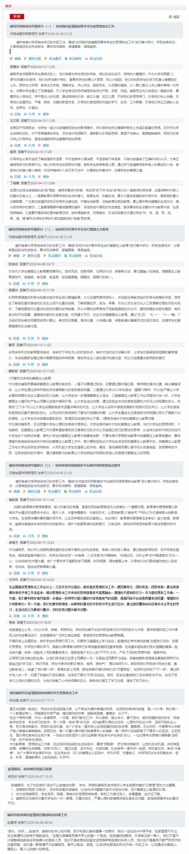自培训以来,参训学员学习热情高涨,积极参加培训班线上课程学习,认真做好学习笔记,撰写心得体会,已全程收看了三期专家直播答疑,并围绕“如何做好疫情期间青年学生的思想政治工作”“如何对当代青年学生进行爱国主义教育”“如何有效利用新媒体平台做好网络思想政治教育”等主题展开了集中研讨交流。辅导员们纷纷表示,此次培训教学内容丰富,极具针对性和实效性,打破空间限制,实现了优质资源共享,为高校辅导员搭建了学习交流研讨的平台,对日后开展疫情防控工作、思想政治教育工作、提升危机处理能力、守护学生平安健康起到了积极的指导作用。