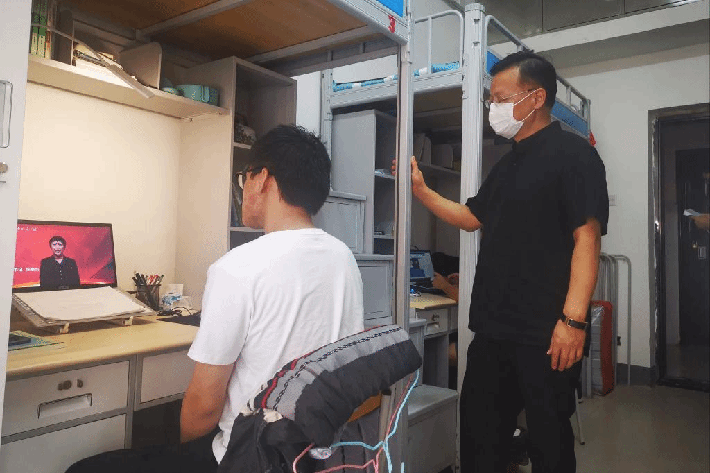 学工队伍一行人分别深入到我院的二区一男生宿舍、三区A女生宿舍与同学们进行了亲切交谈,首先了解了同学们的返校方式和安全防护措施以及到校后的学习、生活状况如何。其次,嘱咐同学们要认真学习学校为大家录制的开学第一课,并牢固树立安全责任意识,把强化个人健康同助力群体健康相结合。再者,目前开学阶段仍以网课学习为主,虽存在着一些不便,但同学们要克服困难、努力学习,为日后的线下教学的平稳过度打好基础。