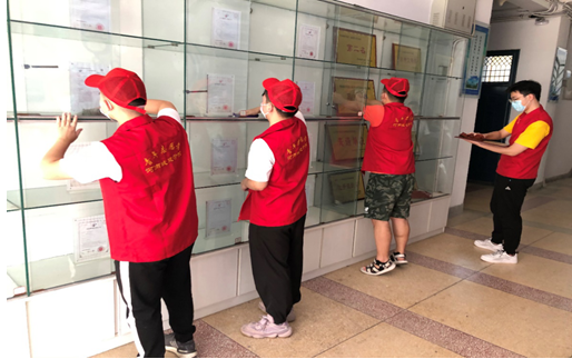 志愿者们正在仔细的擦拭教学楼展柜中的灰尘
