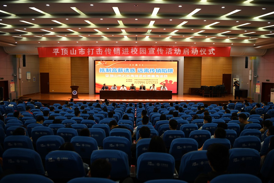 (通讯员 李素锦)9月22日下午,我校在行政楼学术报告厅举行以“抵制高薪诱惑,远离传销组织”为主题的抵制传销进校园宣传教育活动。平顶山市政府、市打传办、市文明办、市扫黑除恶办公室、市市场监管局、市公安局等相关单位负责同志出席活动启动仪式,启动仪式由市打传办主任、市市场监管局书记杨天成主持,我校副校长吴晓红出席仪式并致辞,来自各学院的30余名辅导员代表和200余名学生干部代表参与活动。