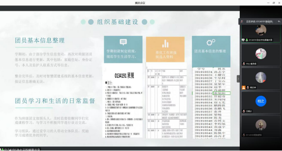 大会第一项全体成员奏唱国歌;第二项朱松岭为大会开幕致辞,他指出,希望各支部书记能够借此机会对标先进、查漏补缺、互相学习、全面提高,以期为学院共青团事业发展贡献更大力量;大会第三项团支书进行述职报告,通过抽签顺序,全体团支部书记依次对于自己的工作经验、优点以及不足进行阐述,反思自己的在工作中的不足和对下一学期的展望;大会最后一项,由魏艳楠进行总结,她表示每一位团支书在过去的2020年工作完成度都非常高,展现了新时代青年的责任和担当,同时勉励全体团支书要“百丈竿头,更进一步”。