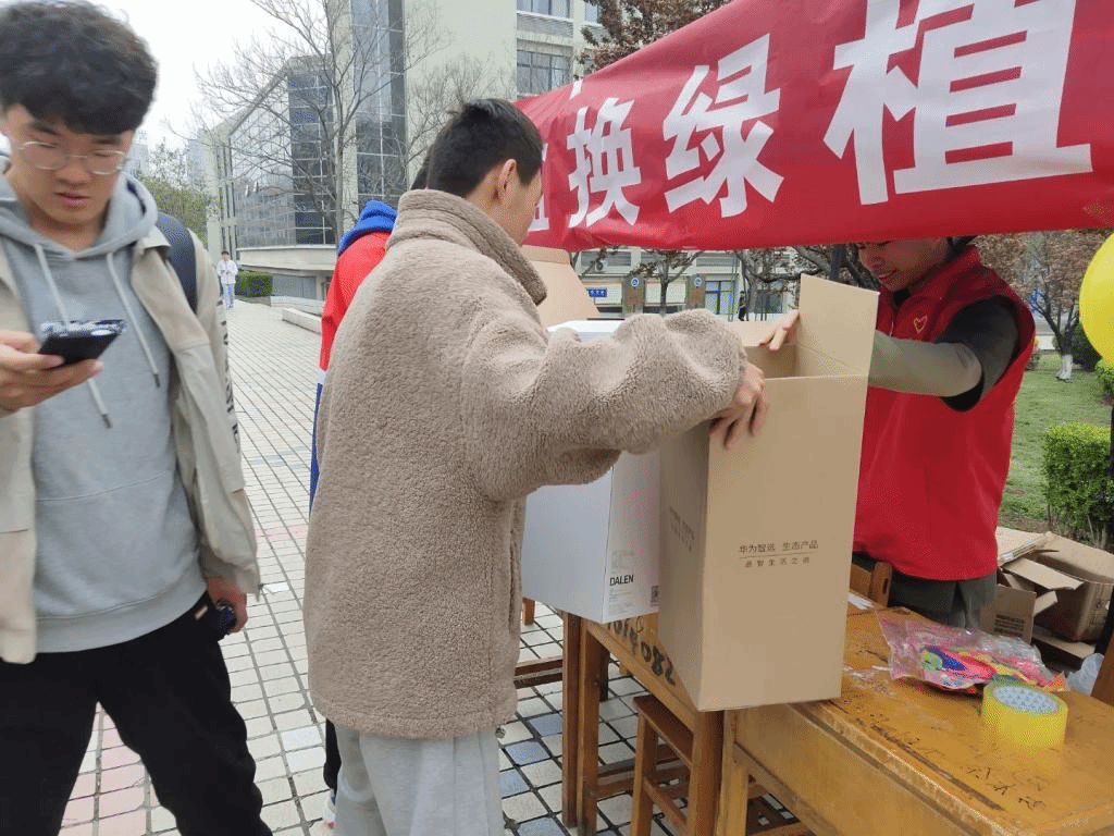 早上八点,志愿者们便开始了匆忙的准备工作,支帐篷、摆兑换物资、张贴兑换规则,大家忙得不亦乐乎。活动一开始,便吸引了同学们的围观参与,面对前来询问的同学,志愿者们详细耐心地讲解了活动参与规则。同学们纷纷拿着宿舍堆积的废纸箱来置换绿植,换到心仪绿植的同学们,脸上洋溢着快乐的笑容。很快,活动现场的盆栽就被置换一空。收尾阶段,志愿者整理好活动现场,联系相关人员回收已打包整理好的废弃纸箱。