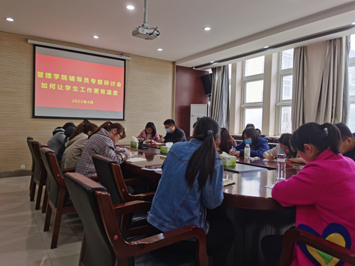 (通讯员 蔡瑞童)4月7号下午,管理学院在8号教学楼三楼会议室召开了“如何让学生工作更有温度”辅导员专题研讨会,学院党委副书记杨璐和全体辅导员参加了本次会议。