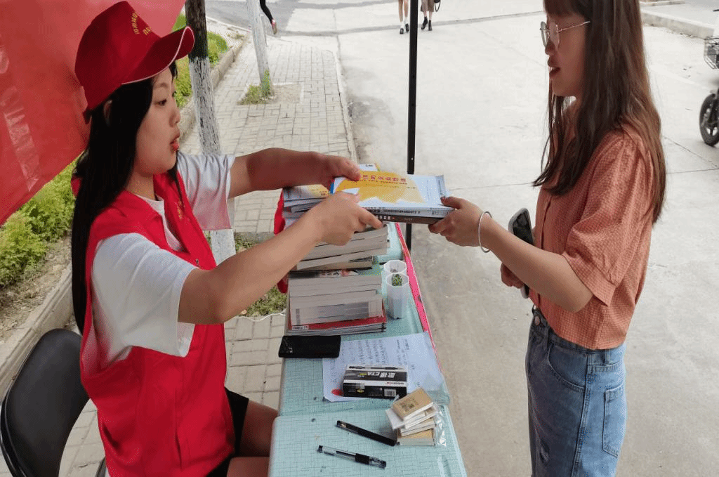 活动准备阶段,志愿者们提前分组并设置好志愿服务点,安排人员轮流值班。活动现场,许多同学上前询问并搬来了自己的学过的教材或阅读过的杂志及小说名著,志愿者对其一一进行分类登记,并根据同学们赠送的图书数量分发多肉植物、便利贴等小礼品。活动结束后,志愿者们对图书进行了分类,将适合中小学生阅读的书籍留下,不适合的书籍卖掉买成合适的图书及文具用品,并把书及用品交给市志愿者协,由其转增给贫困山区的中小学生。