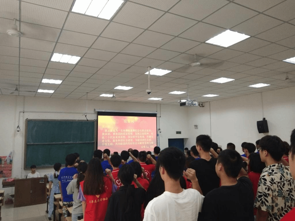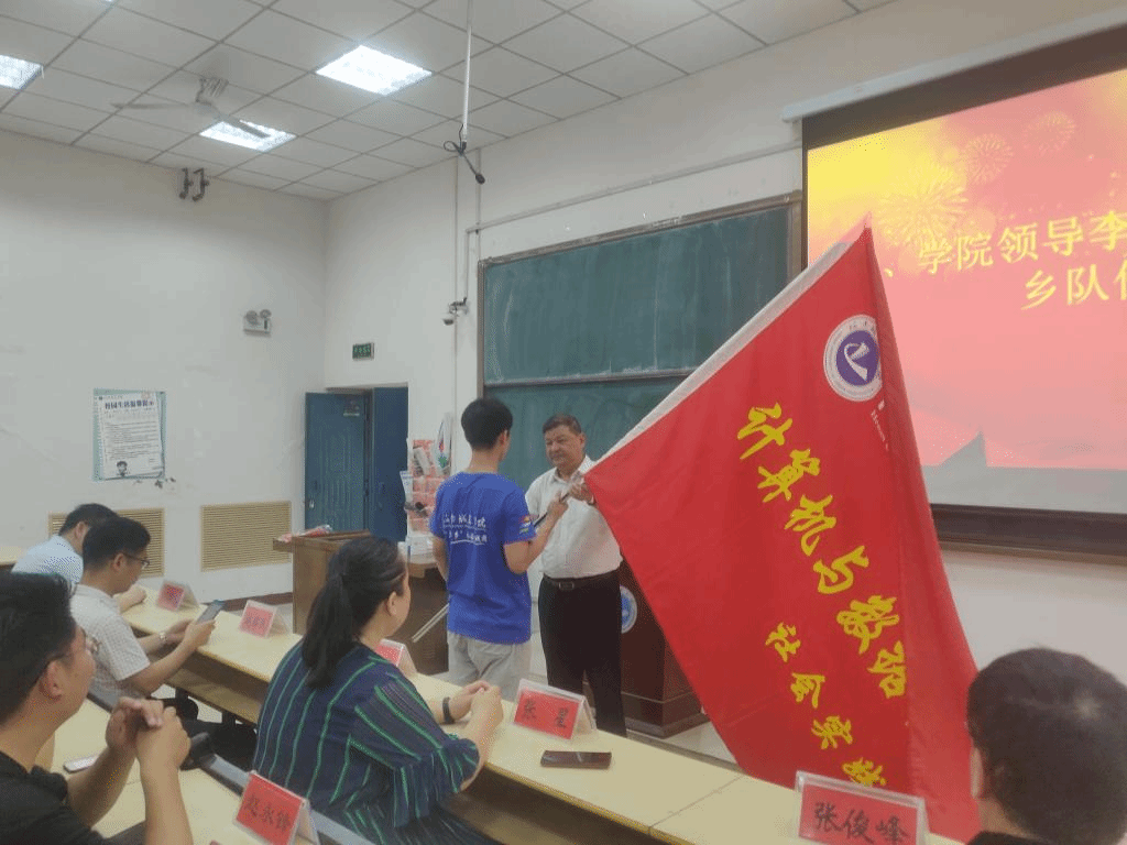 仪式开始后,学生代表李慧如上台发表自己对暑期“三下乡”活动的认识,并呼吁志愿者们共同协作,不怕困难,艰苦奋斗,争取将更多的温暖与知识带到乡村去。接着,指导老师王占洲在仪式上作安全教育讲话,叮嘱志愿者们在“三下乡”活动举办期间,一定要注意自己的财产与人身安全,不单独行动,不脱离团队,在保证安全的情况下努力积极完成实践任务。随后,学生代表带领着志愿者们一起宣读了宣誓词,慷慨激昂的宣誓,表现出了志愿者们无畏困难,在实践中发挥不怕吃苦,从群众中来到群众中去,无私奉献的志愿精神。最后,李宝宏给“三下乡”团队授旗,表达对“三下乡”团队的衷心祝愿,和对此次活动的成功举办的信心。仪式结束后,大家合影留念。