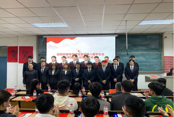 第七届学生会执行主席刘浩然作述职报告,就上一届的学生会工作做了简要回顾与总结,希望新一届学生干部能够“在其位,谋其政,担其责”,携手合作,共同促进学生会更好发展。第八届学生会执行主席胡辰作就职发言。他提出三点设想和决心。随后,张锐老师为第七届学生会主席团成员颁发聘书,闫艺超老师为第七届学生会部长团成员颁发聘书,阿远老师宣读了第八届学生会主席团、部长团成员,张锐为第八届学生会执行主席授旗。