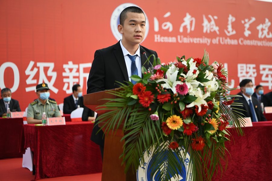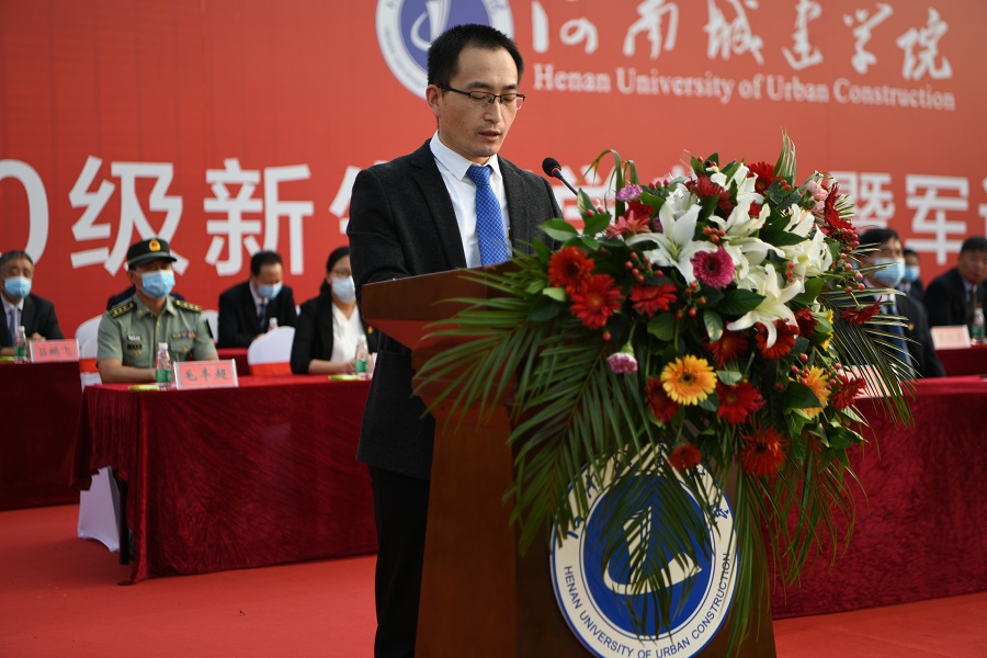 王召东校长满怀深情地对2020级新同学表示热烈的欢迎和衷心的祝贺,向承训教官表示感谢!向在同学们成长、求学过程中,付出辛勤汗水的家长和老师,表示诚挚的感谢和崇高的敬意!王召东以《让青春在奋斗中绽放》为主题做了精彩的致辞,他语重心长地对即将开启大学生活的2020级新生提出了四点殷切希望:一是坚定理想,与祖国同行。作为时代青年,同学们要把个人理想追求融入国家和民族的事业中,与祖国共命运,脚踏实地,在民族复兴的伟大事业中书写出彩人生。二是勤学善思,与奋斗相伴。希望同学们珍惜美好的青春时光,像海绵吸水一样吸取各种知识,像斗士一样勇往直前,让青春在奋斗中焕发出绚丽的光彩。三是勇于创新,与时代共振。希望同学们保持好奇之心,培养科学精神和创造性思维,以蓬勃向上的朝气、以敢为人先的志气、超越前人的勇气,与这个伟大的时代共奔流。四是敢于担当,与青春共成长。希望同学们要有敢于担当的勇气,时刻牢记自己的使命和责任,以饱满的精神、务实的作风、全心全意的学习,在矛盾前不逃避,在困难在不低头,在重任前不懈怠,切实做到不忘初心,牢记使命。