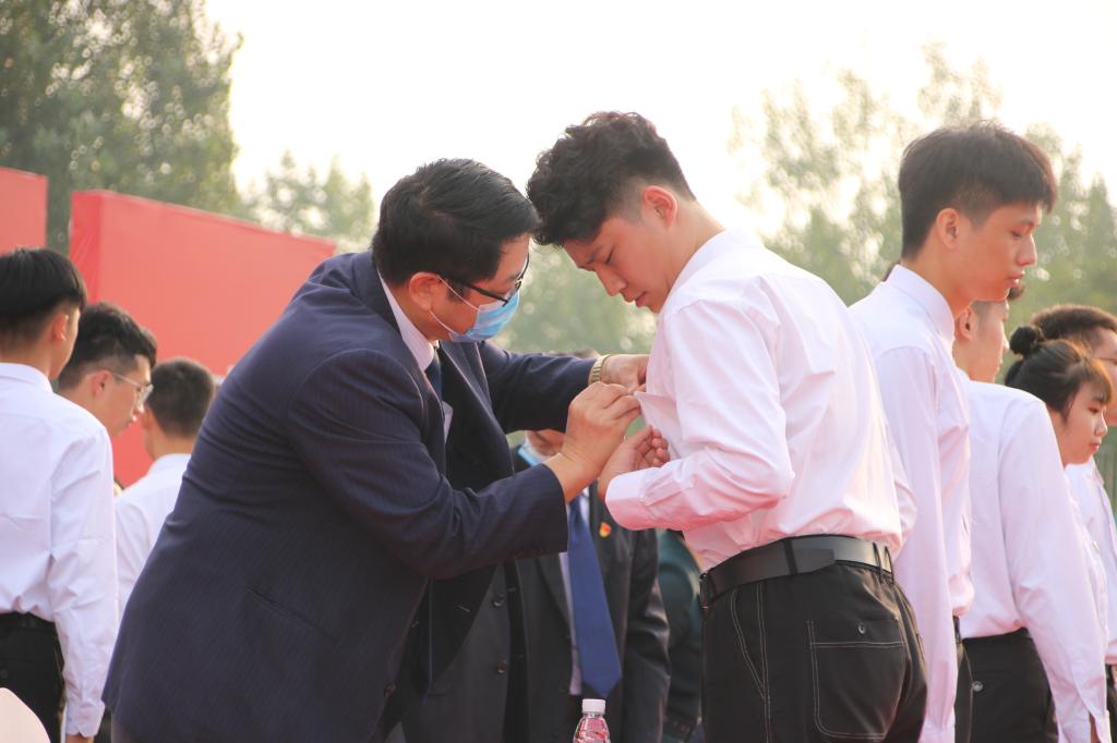 仪式上,与会领导为新生代表佩戴校徽。佩戴上承载着每一位城建人奋斗与梦想的校徽,预示着河南城建学院朝气蓬勃的新生成为了一名“城建”人,也表达着同学们对城建的热爱和归属之情。